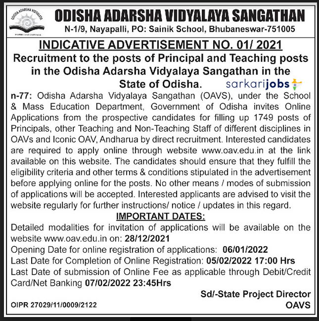 Odisha Adarsha Vidyalaya Sangathan (OAVS) Recruitment 2021: Odisha Adarsha Vidyalaya Sangathan (OAVS) has issued latest notification for 1700+ Principals & Teachers Vacancies. Required education, salary information, application fee and age limit requirement are as following. Eligible candidates must submit applications on or before 5th February 2022. See the notification below to see vacancies/positions available, eligibility criteria and other requirements.